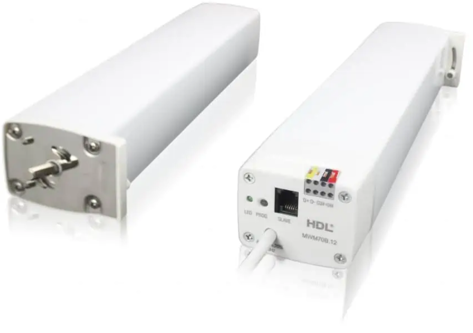 HDL MWM70-RF.12 – Wireless Curtain Motor. Bezprzewodowy silnik zasłonowy (RF). Funkcje: otwieranie, zamykanie, zatrzymanie, sterowanie procentowe. Konfiguracja przez moduł RF HDL (np. HDL-MCIP-RF02.10)