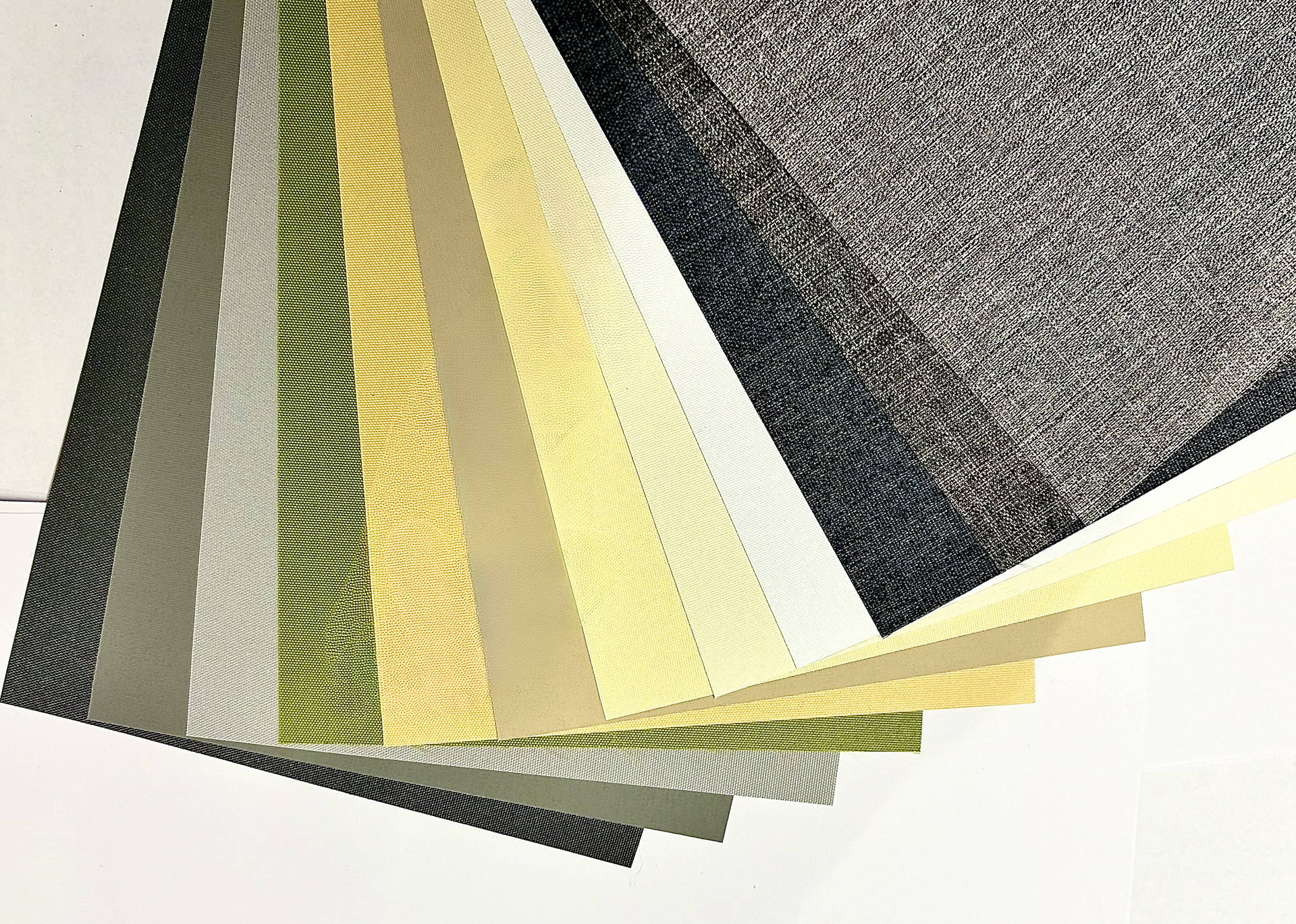 Tkaniny z PVC i włókna szklanego o strukturze siatki. Przepuszczają światło i powietrze, ale ograniczają wgląd z zewnątrz. Idealne do biur i pomieszczeń z ekranami – ograniczają refleksy. Odporność na promieniowanie UV i wysoką temperaturę.